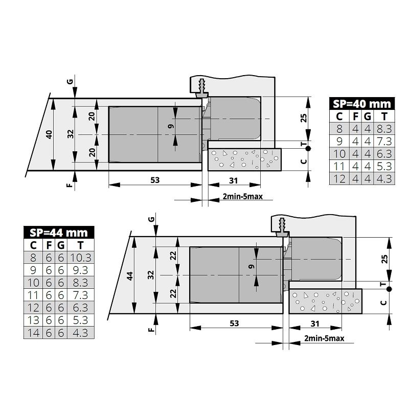 - varčios dalies gylis: 53 mm