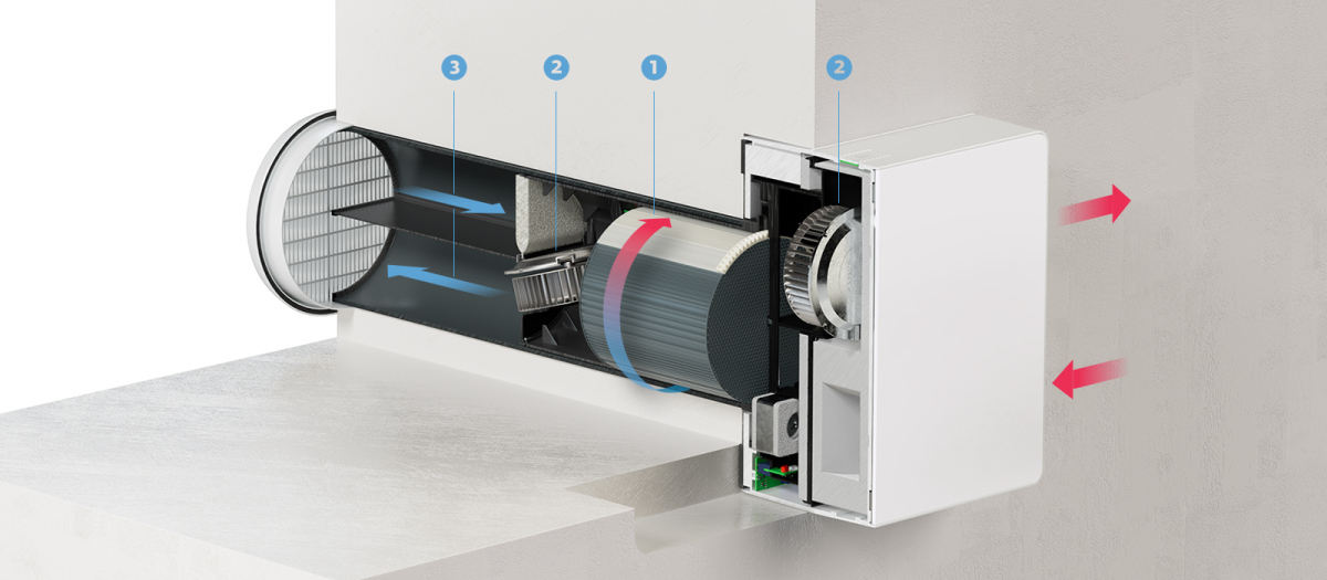 - Viename kompaktiškame įrenginyje derinamas oro tiekimas ir ištraukimas, todėl dėl didelio oro našumo, vienai patalpai reikia tik vieno įrenginio;