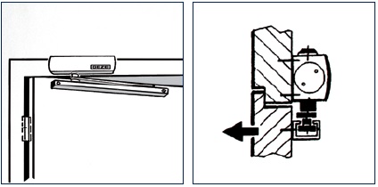 - montavimas durų stūmimo pusėje - prie dėžutės prisukamas uždariklio korpusas