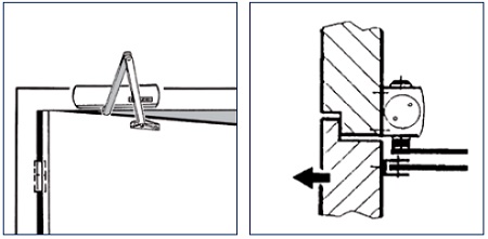 - įmontuotas vėjo stabdys stabdo uždarymo mechanizmą tam tikru kampu – duris tampa sunkiau atidaryti, todėl jos neatsidaro per plačiai