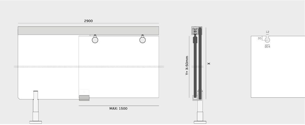 - sistemą sudaro 2 ritinėliai su plokštės tvirtinimu, 2 sieniniai tvirtinimo įtaisai ir apatinės plokštės kreipiančioji
