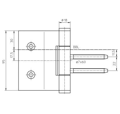 | Atstumas tarp kaiščių centrų | 22 mm |