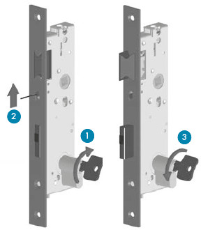 The latch bolt is retracted with the key via the transmission (1). In this position the latch retainer can be pushed up (2). The latch bolt is now held inside the lock case, permitting uninterrupted passage.
