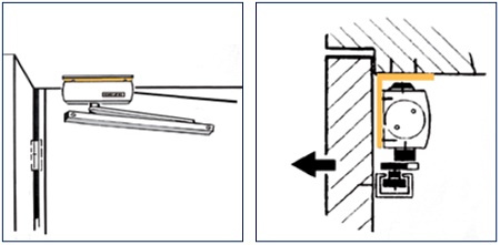 ARRANGEMENT KL - Installation door push side, door closer body installed on the bottom of the frame with a lintel casing bracket.