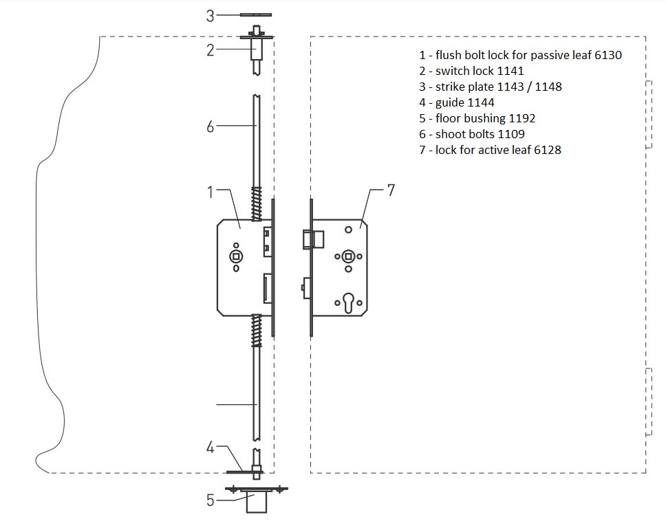 The passive and active door leaves open simultaneously when the panic bar on the passive door leaf is pressed. Shooting bolts in the passive leaf lock automatically with the top switch lock, thus ensuring the door is locked automatically.