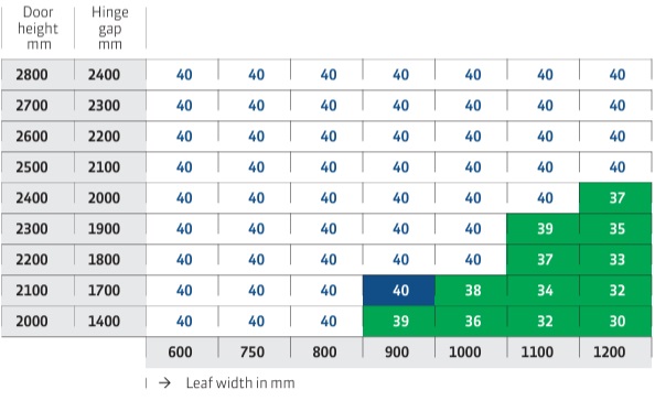 - load capacity: 40 kg (refers to the use of 2 hinges per door leaf 900 x 2100 mm)
