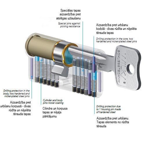 - hardened steel cylinder core pins for anti-drill protection